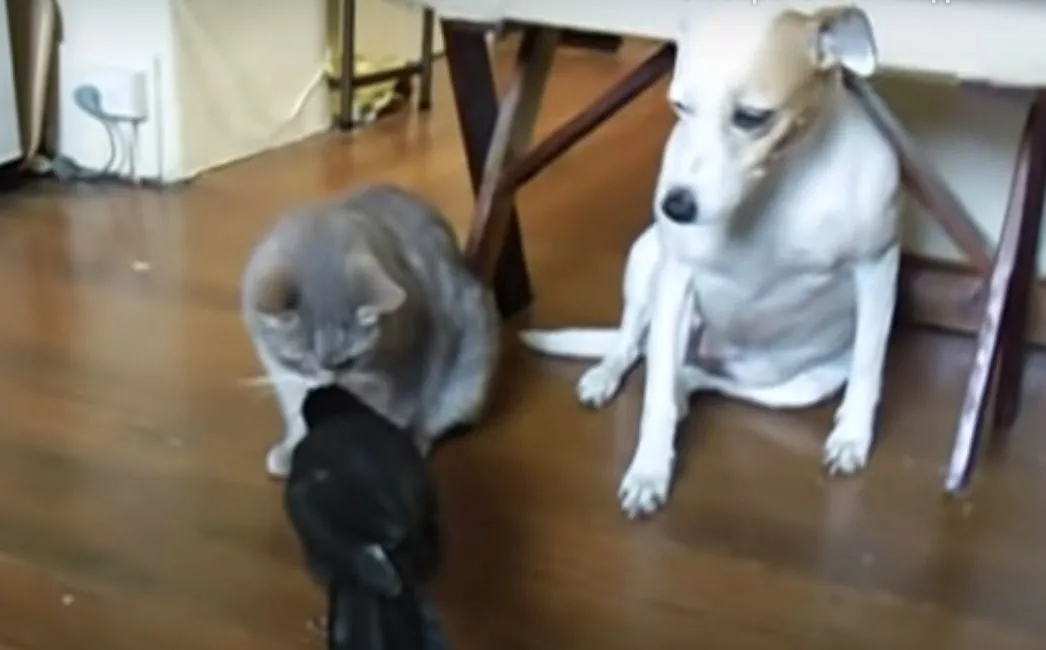 Якщо у вас немає знайомих і приятелів, які могли б допомогти в цій ситуації, можна звернутися до ворони. Зрозуміло, не кожна ворона захоче доглядати за вашими вихованцями, але птиці з відеоролика нижче це заняття безумовно приносить задоволення. Вона бере дзьобом корм з миски і відносить його кішці. Турботливий птах не обділяє увагою і собаку. Господиня-ворона стежить за порядком, тому господині тварин зовсім не варто турбуватися про стан своїх вихованців під час відрядження.