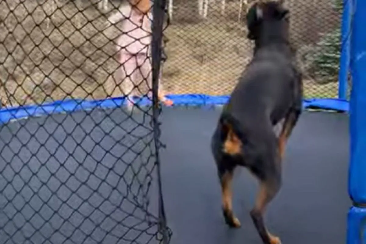 Алекс з Вайомінгу всього три роки, а її собаці, ротвейлеру Коні, всього 2 роки. Тобто, ідеальна комбінація віку і невеликої ваги, щоб як слід пострибати на батуті! І вони це роблять буквально наввипередки, причому з боку ще спробуй зрозумій, хто більш щасливий — дівчинка чи собака? Але що задоволення отримують всі, включаючи і маму за кадром, це очевидно!