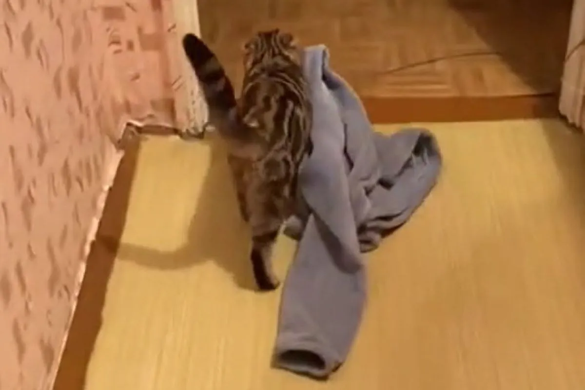 Відеоролик дозволяє спостерігати за котиком, який вирішив вкрасти штани свого господаря, справедливо розсудивши, що без них чоловік за двері точно не вийде. Схоже, пухнастик вважав, що у його людини немає запасних, та ще й вчепився в них мертвою хваткою, не бажаючи віддавати.