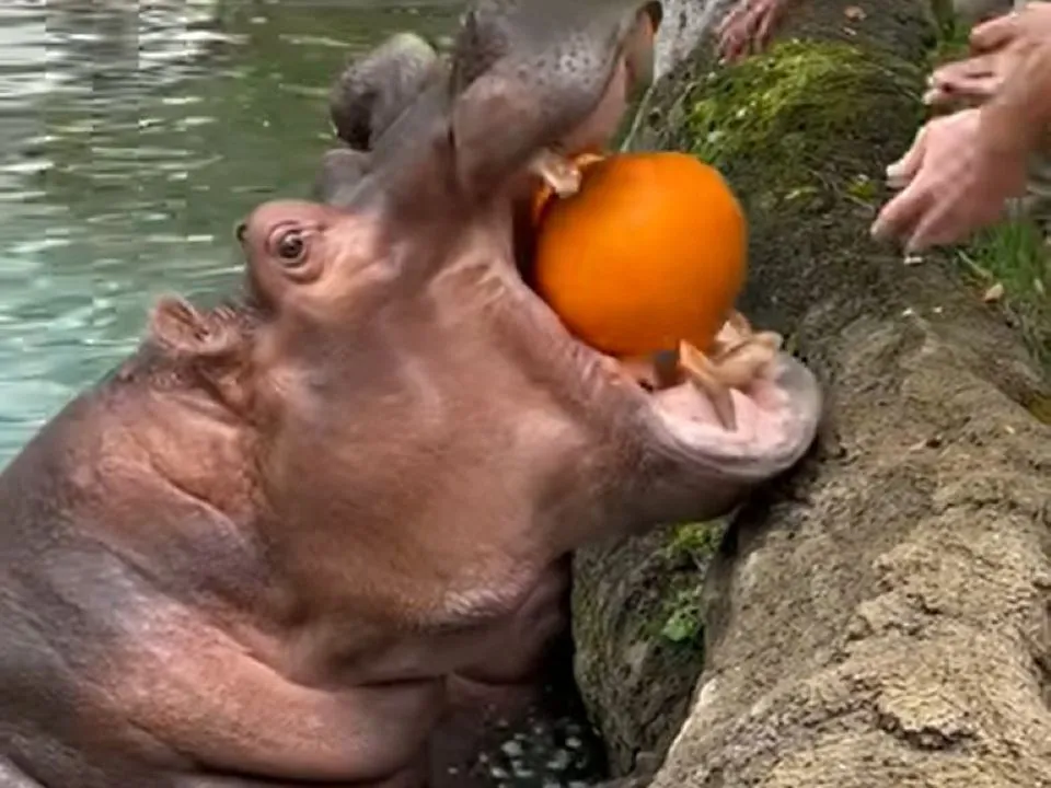 Відео із зоопарку швидко стало вірусним. У ньому співробітники підходять до тварин та просять їх відкрити свої роти. Бегемоти слухняно виконують прохання, а працівники парку акуратно закидають гарбузи та тікають!