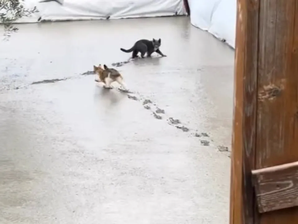 У випадку на відео гарному бетонному покриттю завадили дві пухнасті обставини непереборної сили, які вирішили попустувати по свіжому бетону. Цікаво, чи підходить така ситуація під відповідний пункт договору з підрядниками?