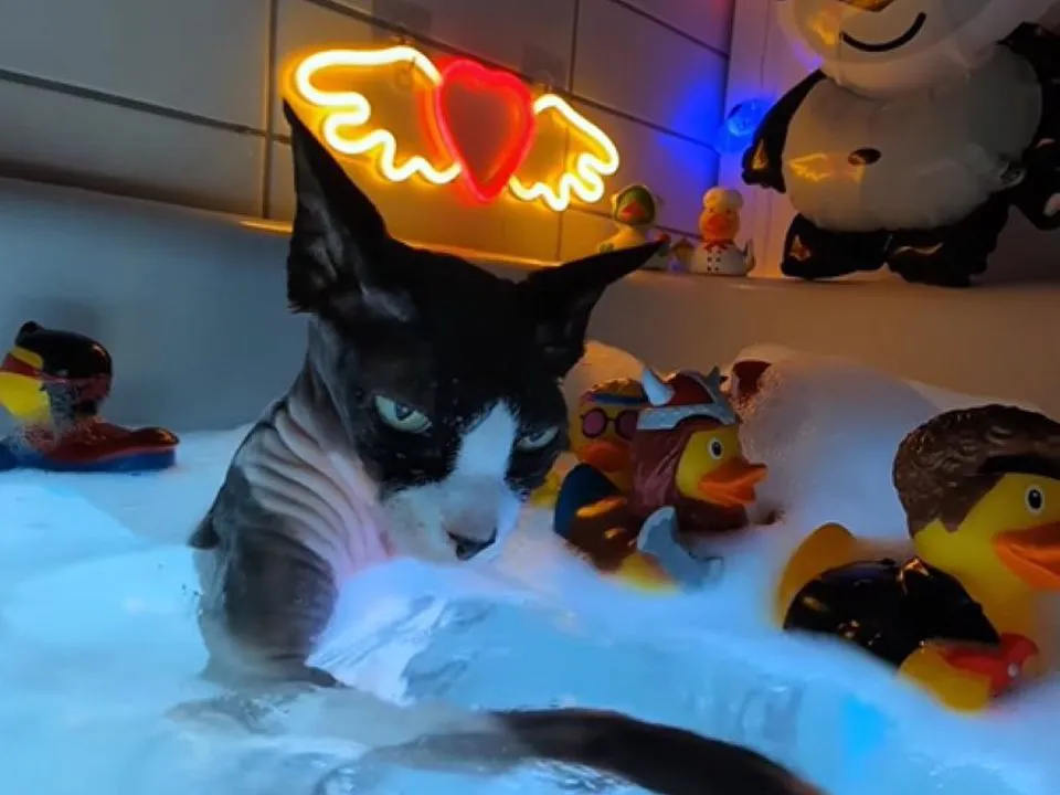 Котик із задоволенням влаштував купання у ванні, плескаючи лапками по воді, ніби його зовсім не хвилював той факт, що більшість кішок ненавидить воду. Виглядав він при цьому як король ванни, впевнений, що ніхто і ніщо не зрівняється з його стилем, а гумові качечки виконали роль його свити. Що ж. Цей «хлопець» явно розуміється на хорошому і модному відпочинку.