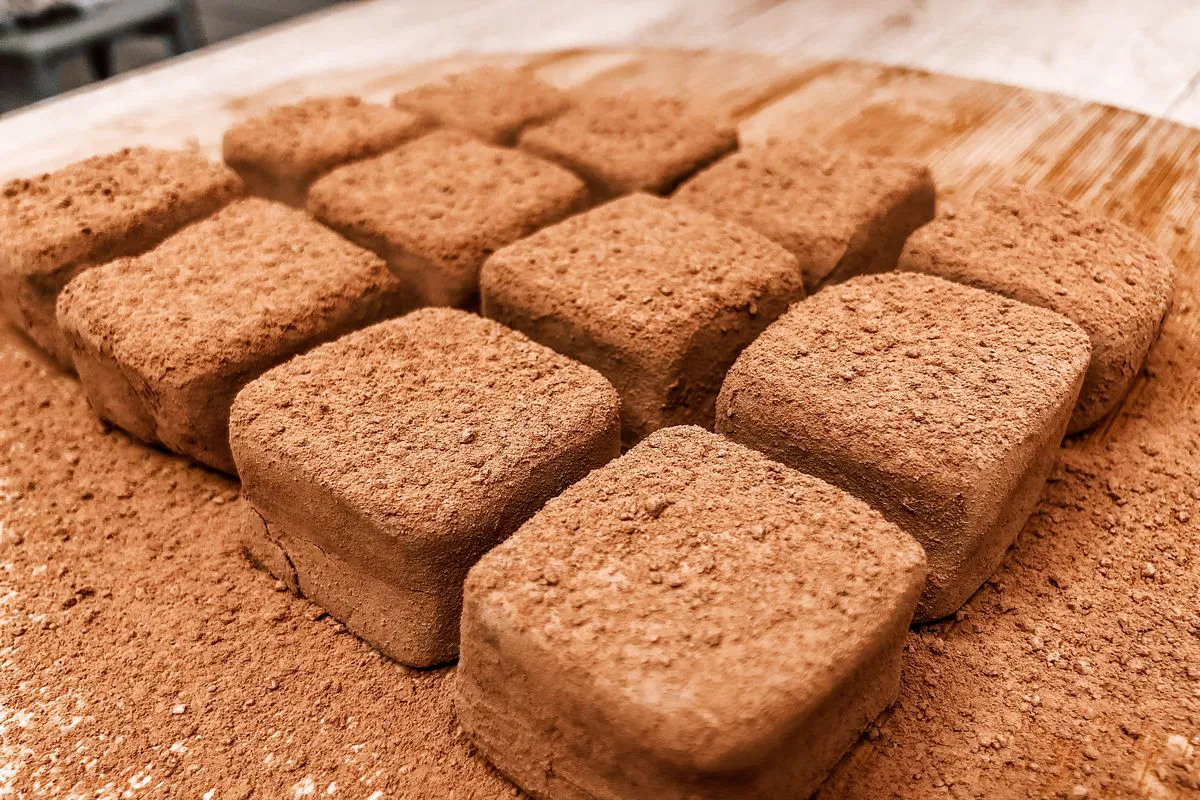 5. Дістати суміш з холодильника та покласти на подушку з какао, зверху теж посипати какао. Розрізати на квадратики.