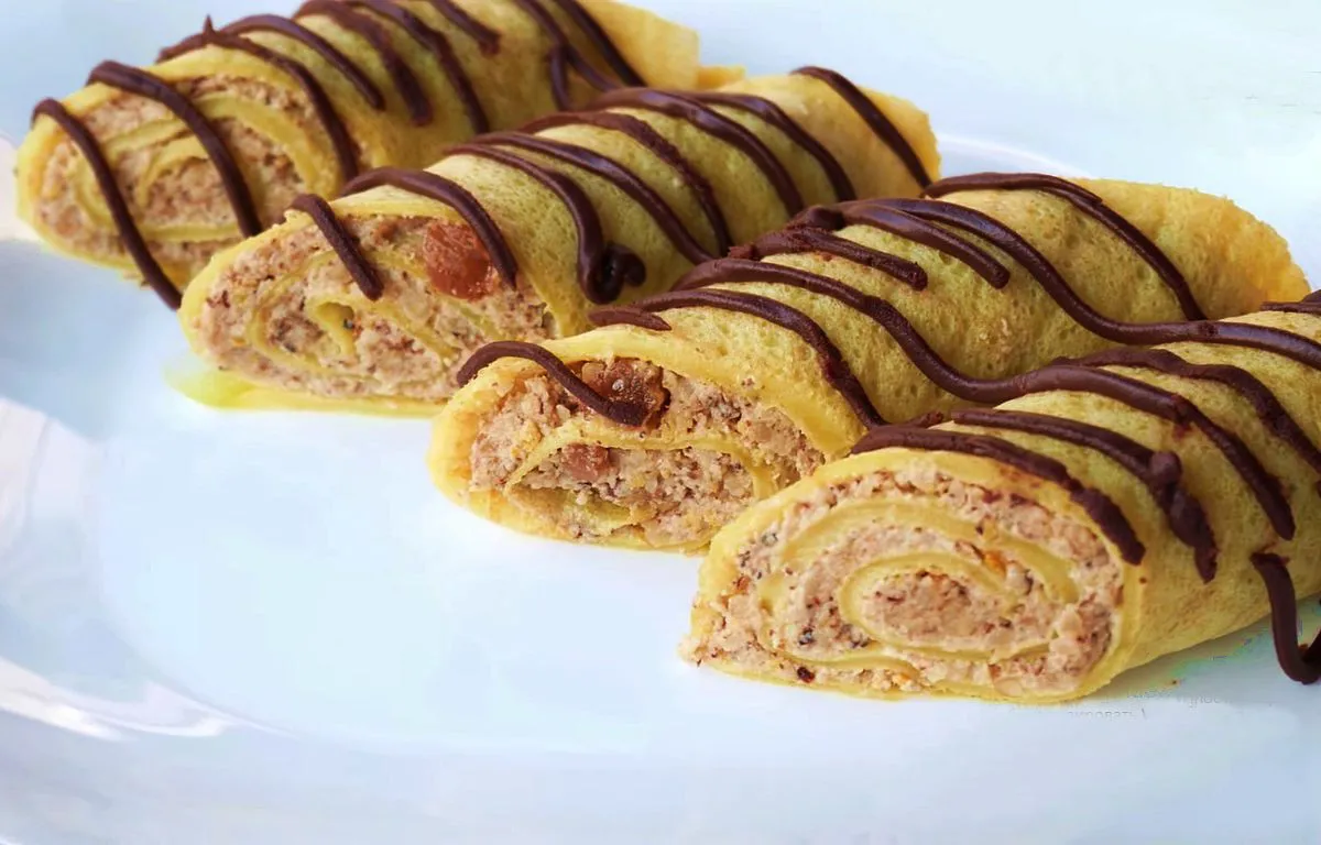 - Після закінчення потрібного часу начинка стане більш густа. Розподіляємо її рівномірно по млинцях і кожен з них загортаємо в рулет. Потім розрізаємо на 2-3 частини і викладаємо на блюдо для подачі.