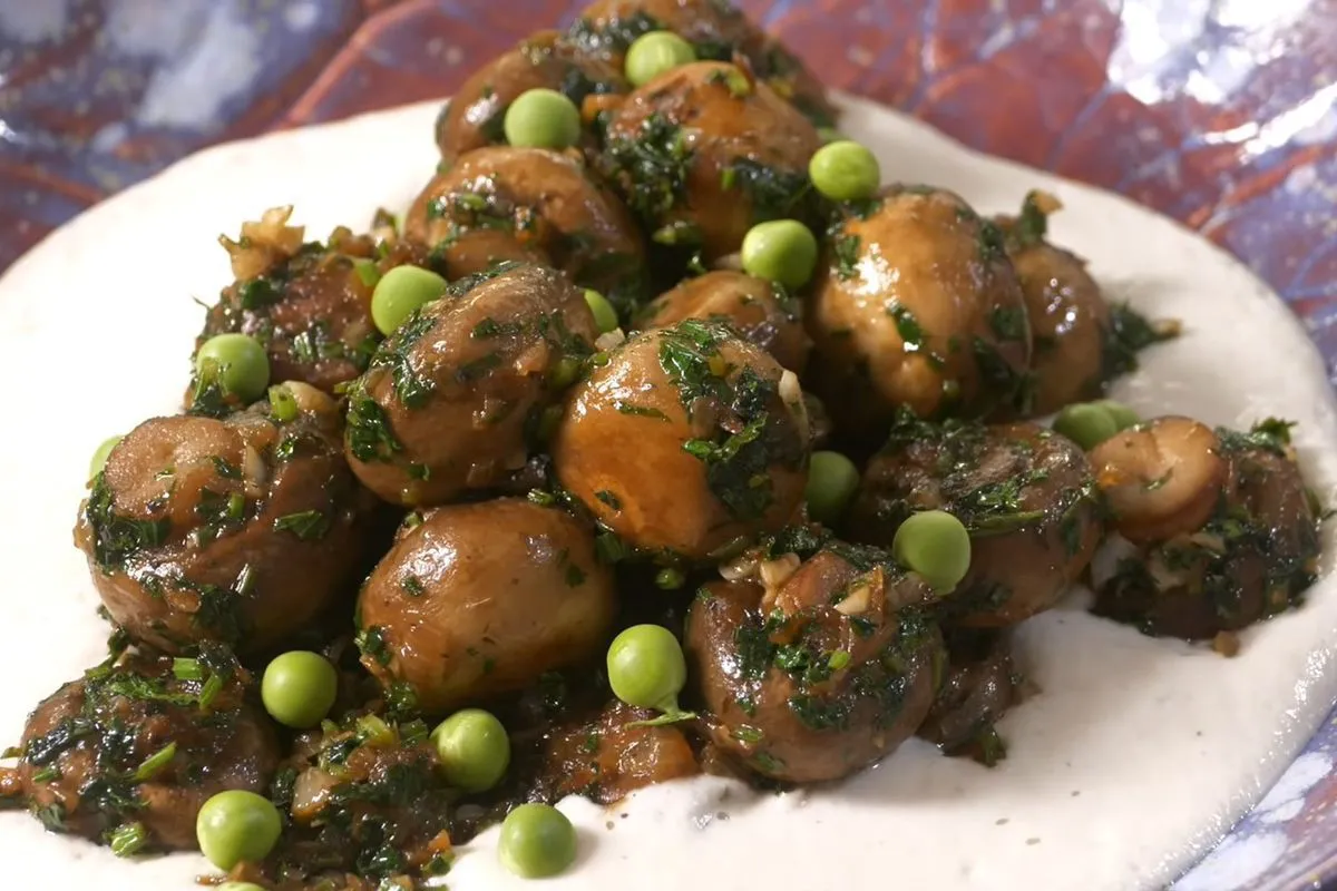 Поверх соусу викладаємо гриби, додатково прикрашаємо страву зеленим горошком або будь-якою зеленню і подаємо до столу.