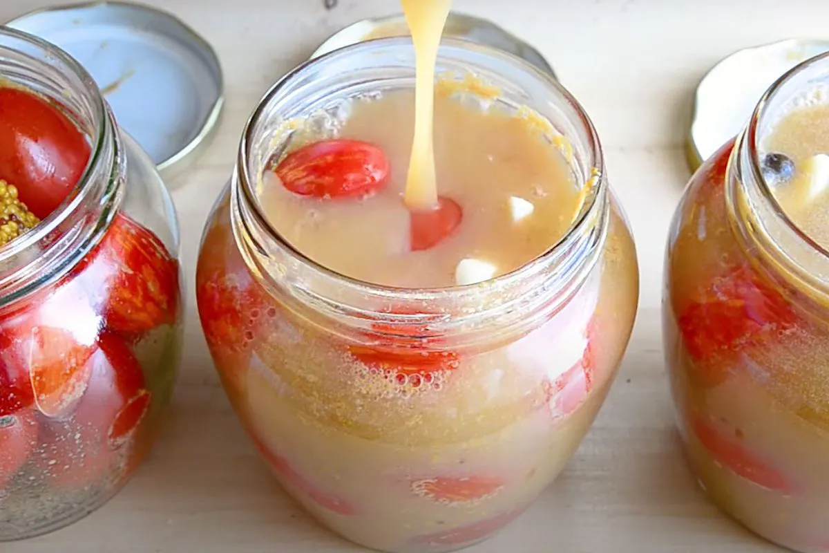 5. Залийте помідори киплячим маринадом і щільно закрутіть банки кришками. Остудити, перевернувши банки догори дном і укутавши в ковдру, а потім перенесіть в шафу чи комірчину на зберігання.