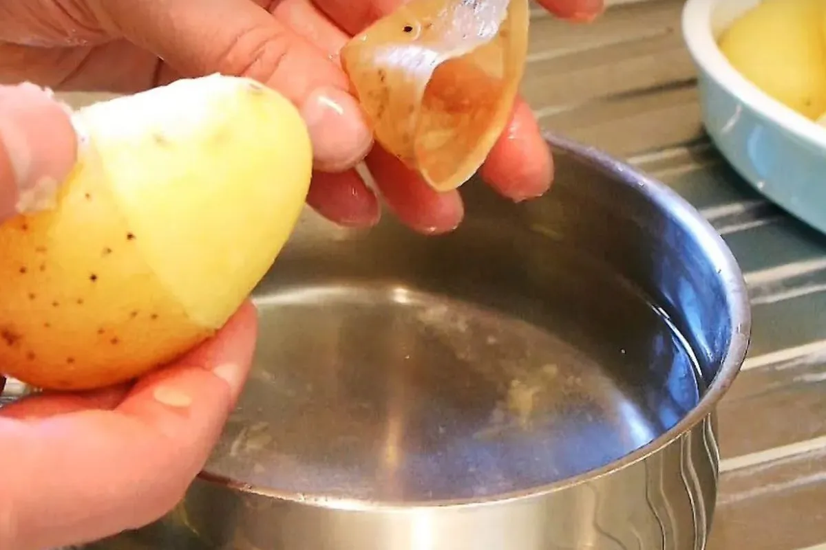 Перед варкою берете картоплю і робите неглибокий надріз по колу по середині овоча. Заливаєте окропом і ставте варитися як завжди. Після закінчення часу — зливаєте окріп та заливаєте картоплю на кілька хвилин холодною водою. Далі залишиться тільки зняти шкірку з обох сторін.