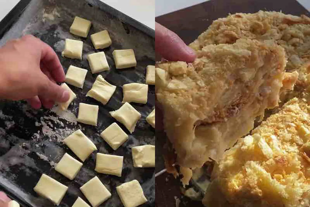 Тепер беремо листкове тісто, розрізаємо на невеликі квадратики та відправляємо в розігріту до 200 градусів духовку на 25 хвилин.