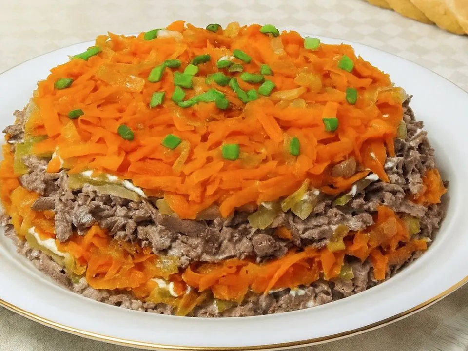 У салатницю викладаю шарами: легені, цибуля, морква і ще раз легені, цибуля, морква. Між шарами трохи майонезу або сметани за смаком.