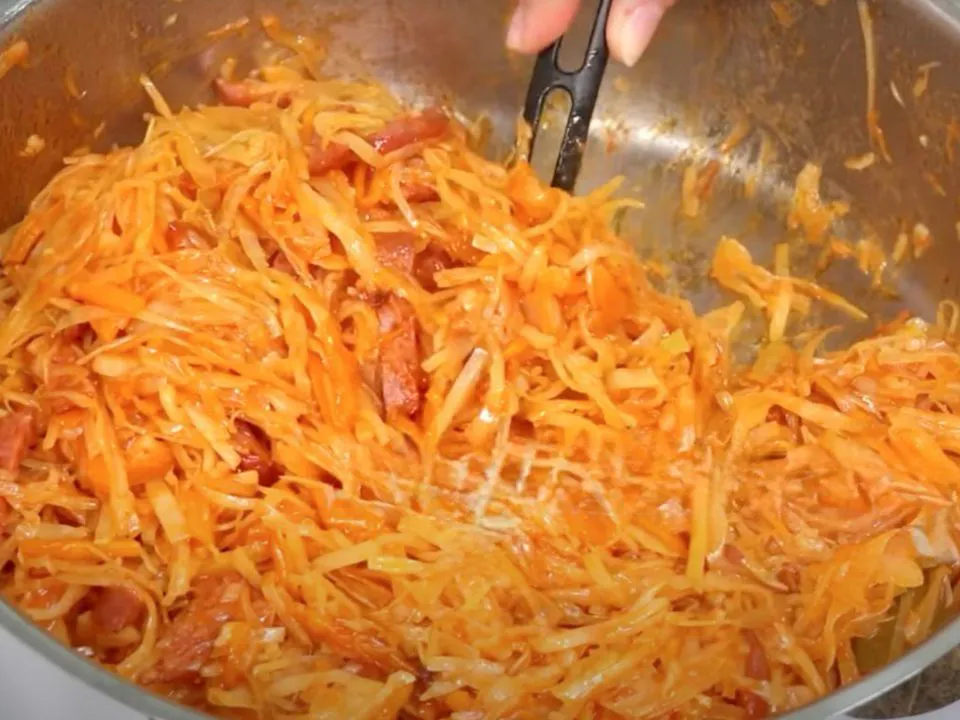 Тепер сюди ж відправляю моркву, натерту на великій на тертці. Обсмажую 2-3 хвилинки і додаю нарізану ковбасу.