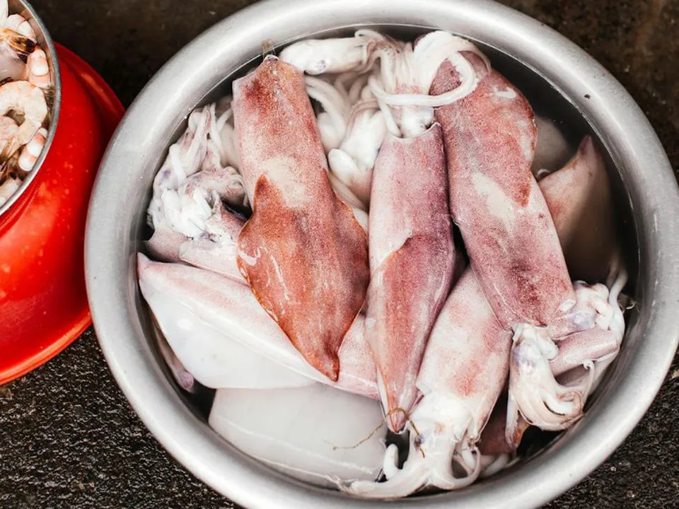 Кальмар просто у вас на очах почне «роздягатися». Не гаючи ані миті, одразу виймаємо його з окропу й занурюємо в крижану воду. Беремо наступного і повторюємо ту саму маніпуляцію, доки не закінчаться кальмари.