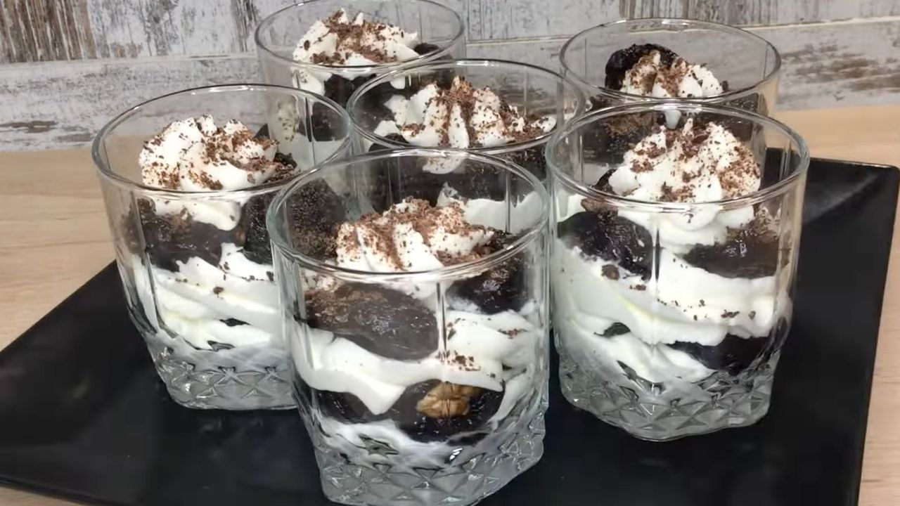 Закладаю чорнослив з горіхами та шар промазую кремом. Кладіть чорнослив щільно і не шкодуйте крему. Крем повинен обволікати кожну чорносливку. Викладаю шарами до верху (останній шар — вершковий). І прикрашаю тертим шоколадом.
