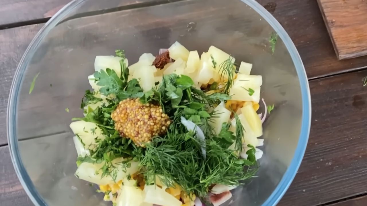 1. Додаємо до інгредієнтів гірчицю в зернах, майонез та, за бажанням, трохи аджики.