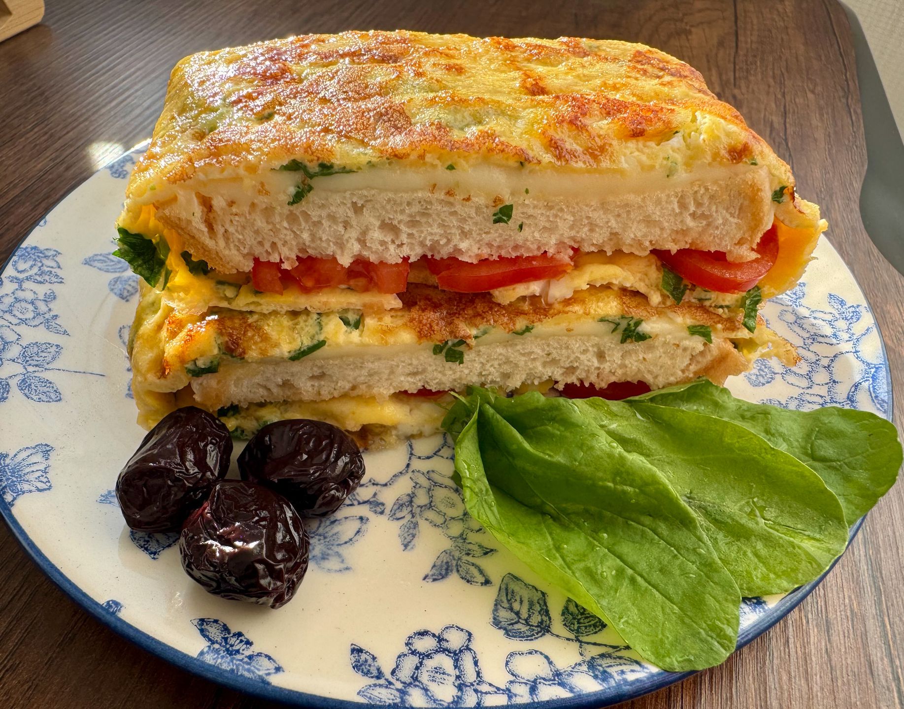 Щойно суміш згусне й яєчний млинець почне підсмажуватися, кладемо зверху скибочку сиру.