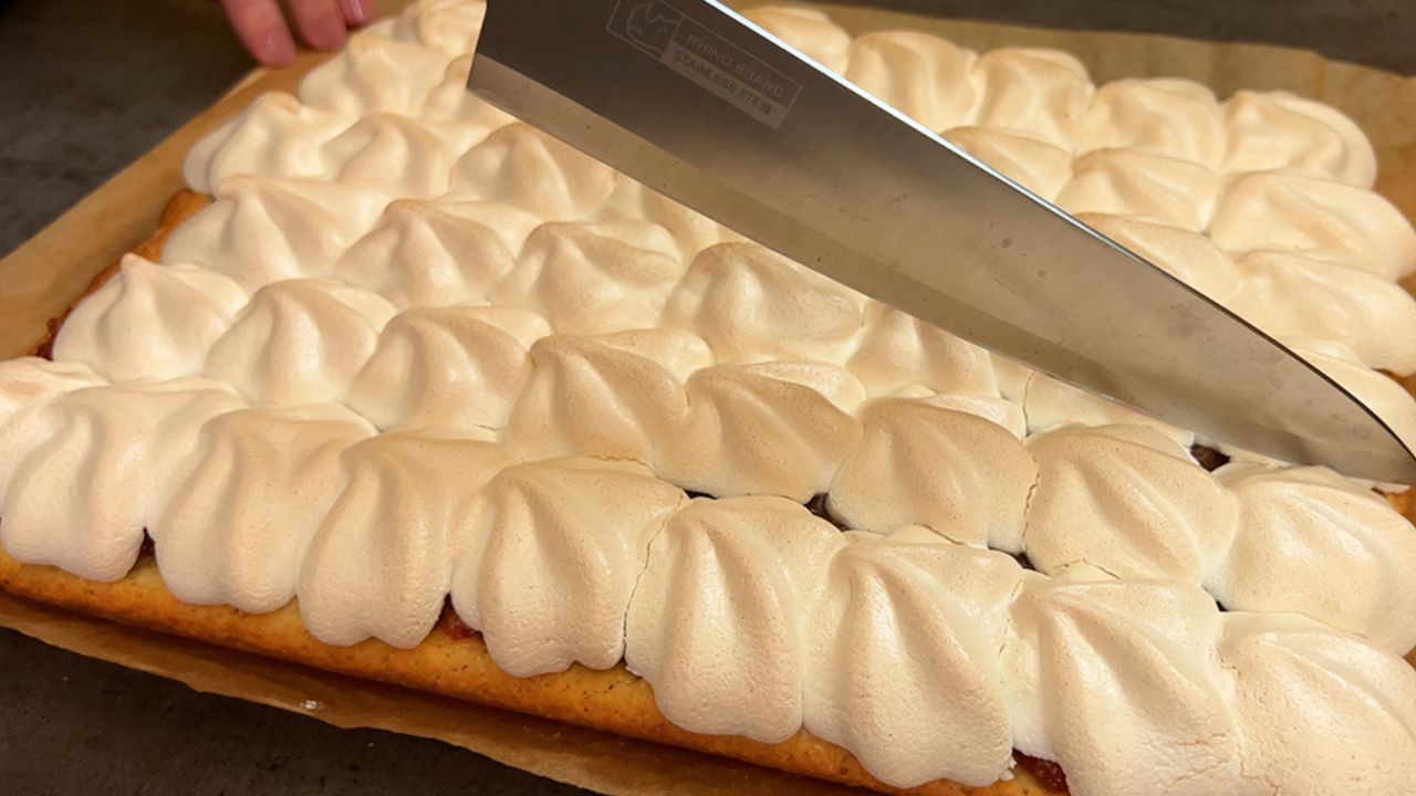Ріжте пиріг лише після повного охолодження. Якщо різатимете його гарячим, варення витече на стіл, а меренга потече.