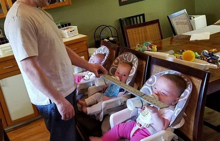 Наприклад, на головному фото ви можете розглянути, як батько справляється з годуванням відразу трьох немовлят. «Всі вони хотіли їсти одночасно, тому я не міг придумати нічого кращого, ніж зробити набір з трьох пляшок і лінійки». Іноді найбезглуздіші ідеї — найкращі!