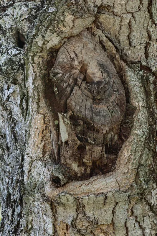 На перший погляд, на фотографії звичайне дерево. Але якщо придивитися, пильний глядач повинен бути в змозі побачити сову замасковану на ньому. Її пір’я плавно змішуються з візерунками стовбура. Цю північноамериканську сову практично неможливо виявити, інформує Ukr.Media.