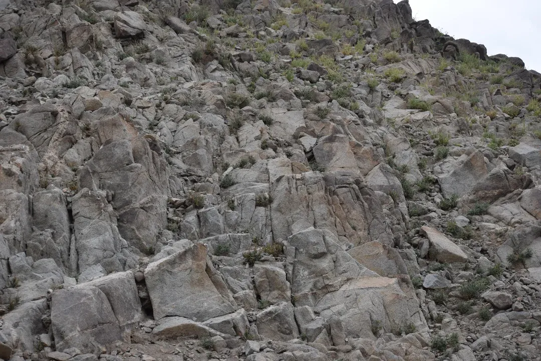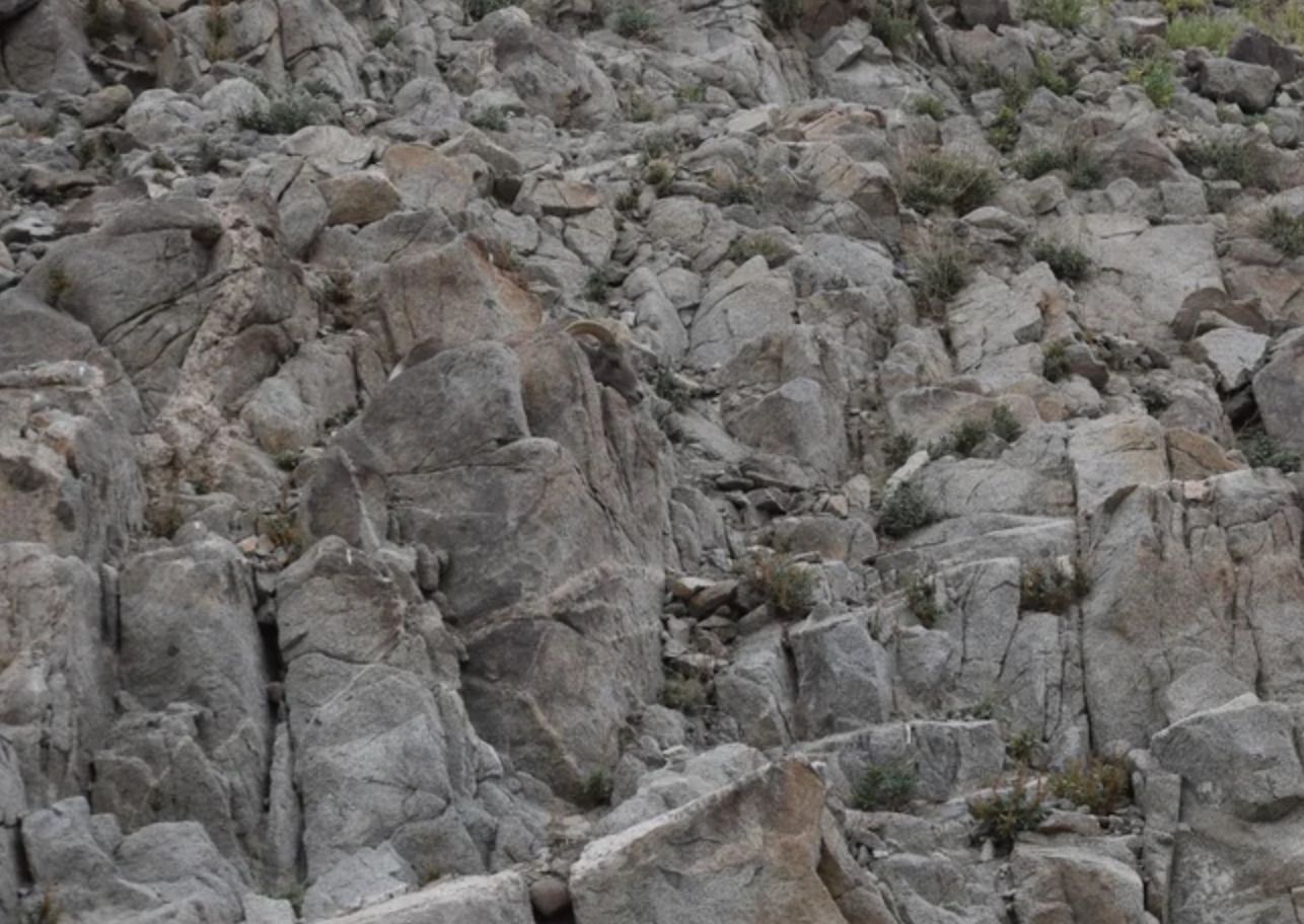 На фото вище — гірський пейзаж, завалений величезними валунами. Купа сірого гострого каміння тільки й чекає, щоб відвернути вашу увагу, але десь там причаївся гірський козел.