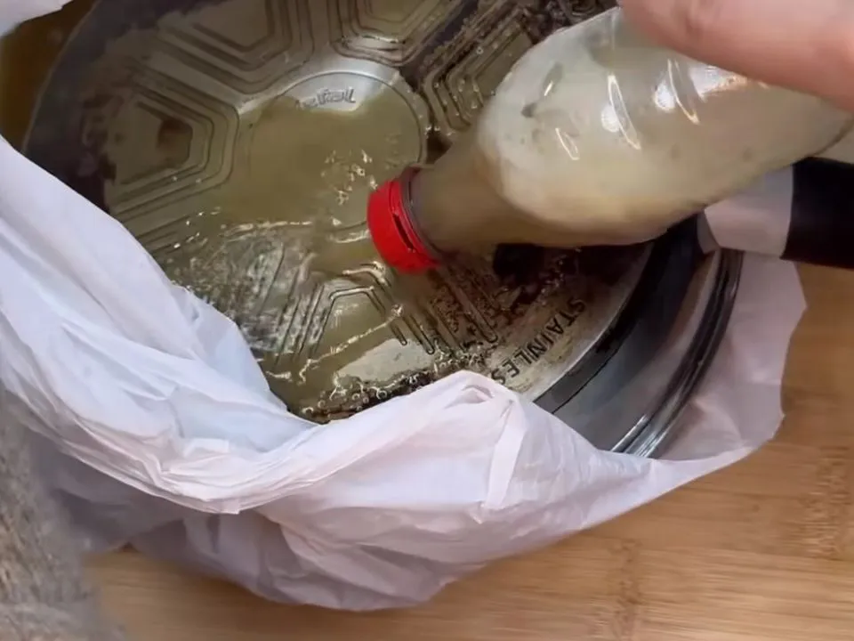 Просто з’єднайте усі інгредієнти в одній ємності. Для зручності використання перелийте засіб для чищення в пляшку, а в кришці зробіть невеликий отвір. Помістіть сковороду у великий пакет, зверху вилийте засіб для чищення.