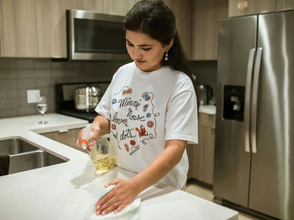 Спирт миттєво розчиняє жир та бруд, а миючий засіб м’яко очищає оброблені поверхні від забруднень. Цей метод дозволяє швидко та ефективно очистити кухонні меблі, заощадивши ваш час та зусилля.