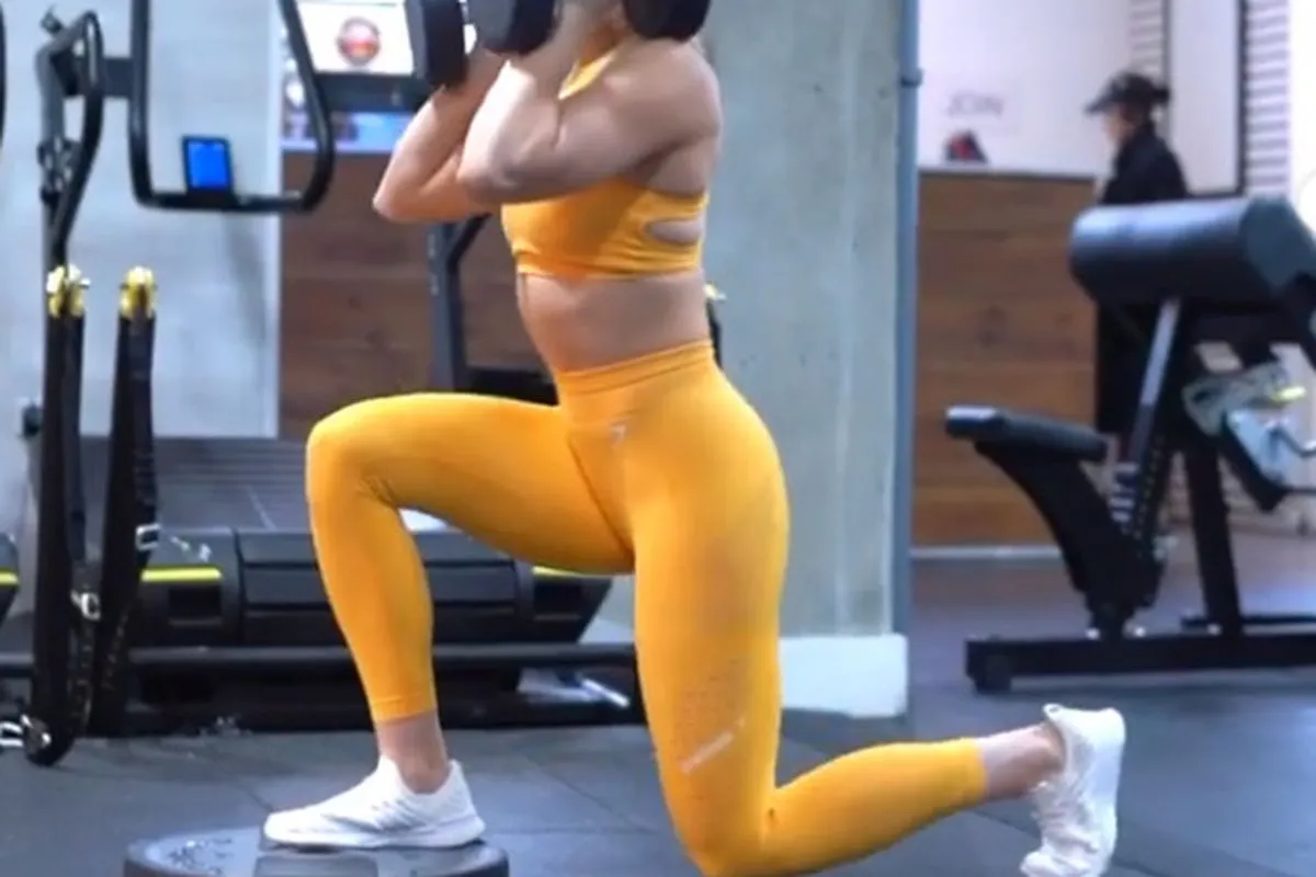 4. Випади назад з підвищення з гантелями на плечах — 4 підходи по 12 разів в сумі.