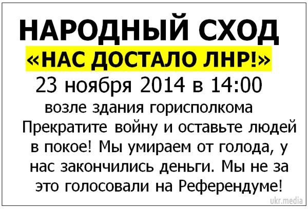 23 листопада в містах, підконтрольних ЛНР місцеві жителі вирішили провести «Народний сход». Люди півроку не отримують зарплат, пенсій, соціальних допомог. У Луганській області зафіксовано кілька десятків голодних смертей. При цьому ніяких перспектив на зміну ситуації немає. «Ополченці» відкрито визнають, що не можуть виплатити жителям навіть по 500 гривень.