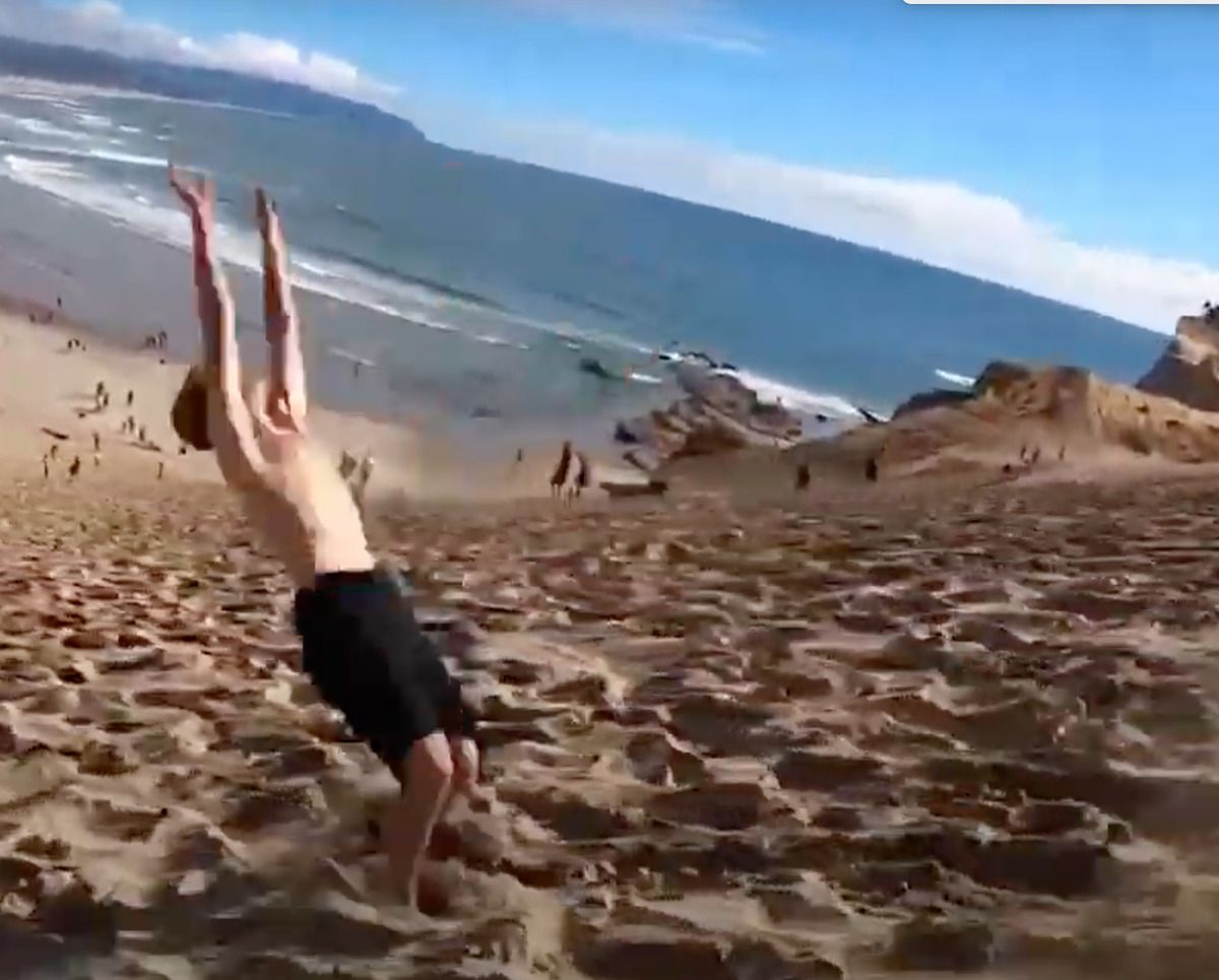 Гімнаст шокував любителів пляжного відпочинку, коли на великій швидкості, роблячи сальто назад, спустився з піщаного схилу ближче до води, інформує Ukr.Media.