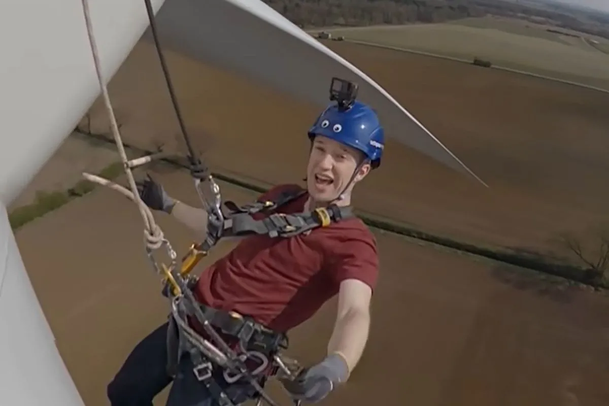 Британський YouTube-блогер Том Скотт опублікував у себе на каналі відео з новим трюком. Молода людина забралася на верхню частину одного з вітрогенераторів компанії Octopus Energy, а потім спустився звідти на землю, використовуючи лебідку, інформує Ukr.Media.