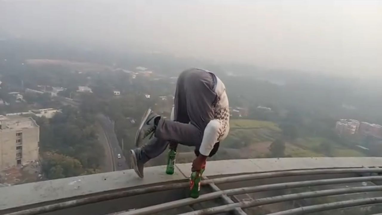 На відео, від якого пітніють долоні, хлопець балансує на скляних пляшках, виставлених на самому краю конструкції. А "на десерт" він вирішив повисіти вниз головою на зовнішній рамі вежі, тримаючись лише руками. І жодної страховки!
